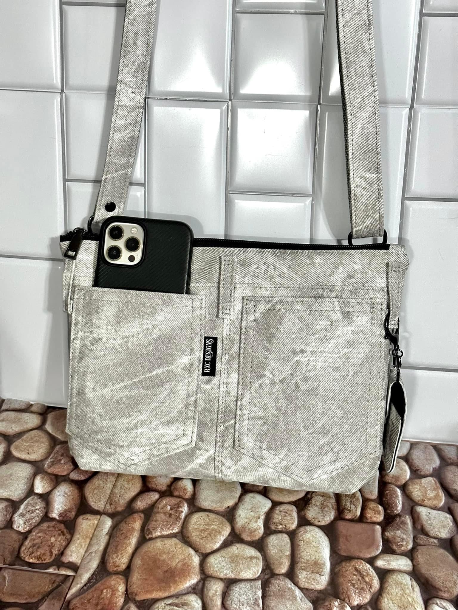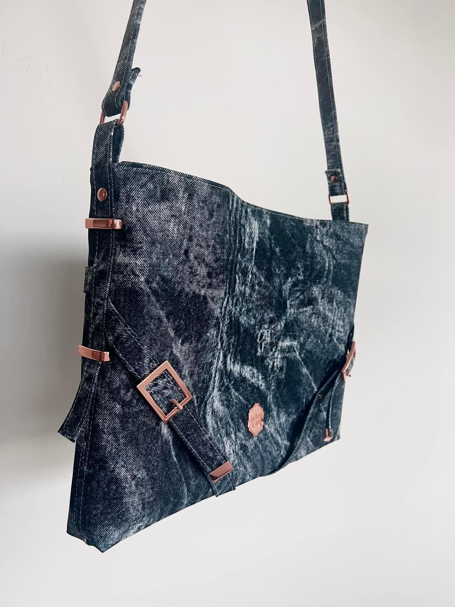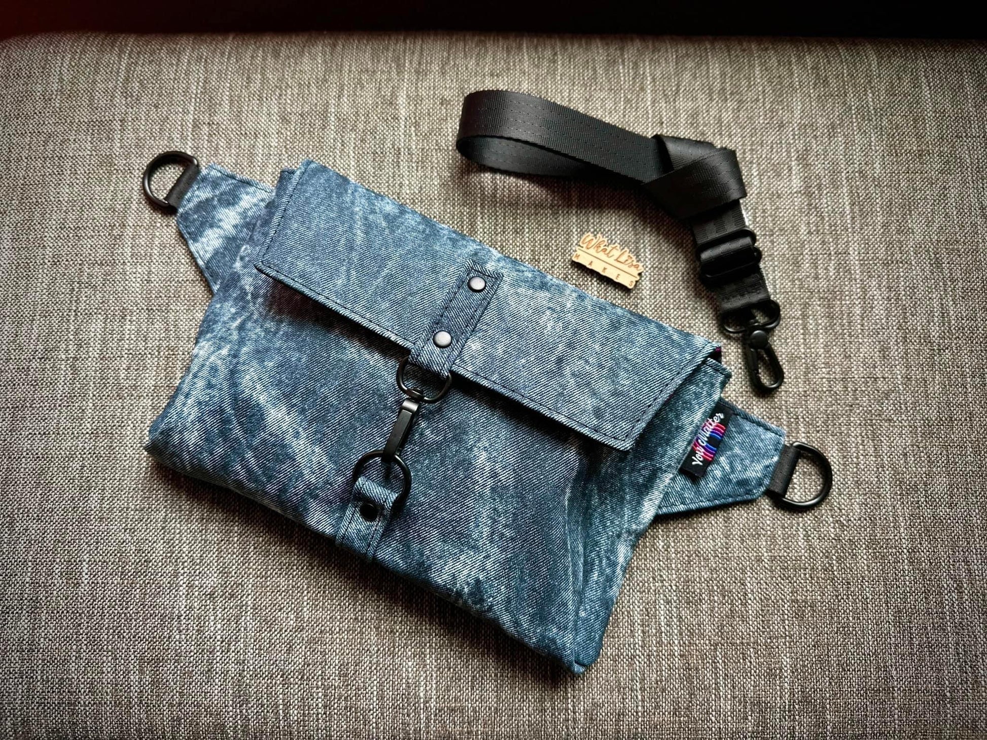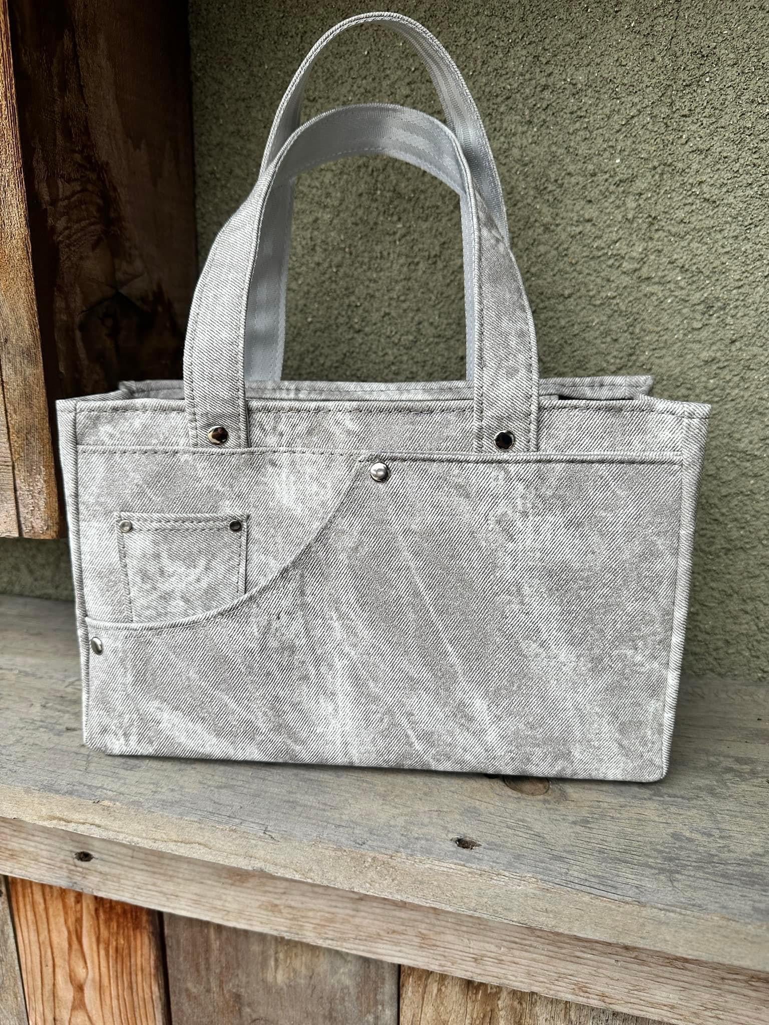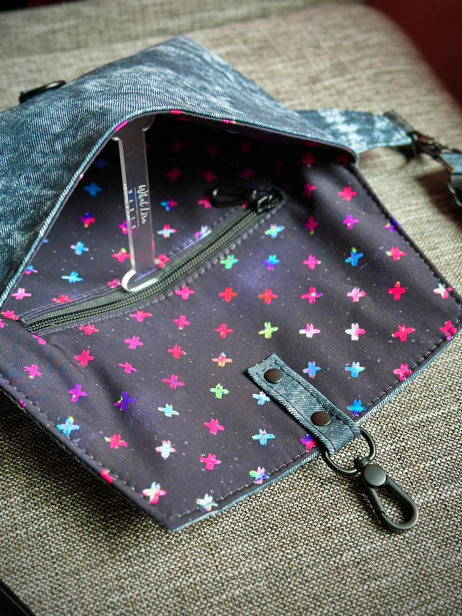 Think of this like suede and vinyl had a baby, but with a 90's twist! Domestic friendly like most of our textiles, it measures about 1.0mm thick but isn’t heavy or overly dense. You can forego interfacing this as there's enough structure without it. (Bag shown is the Aries by Knotted Threads Co. and has zero interfacing used.)